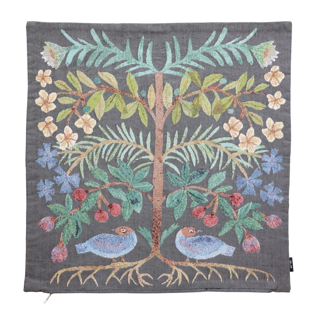 クラシカルな風合いが魅力のゴブラン織りに、松尾ミユキさんらしい、植物と動物の切り絵モチーフが映えるクッションカバーです。