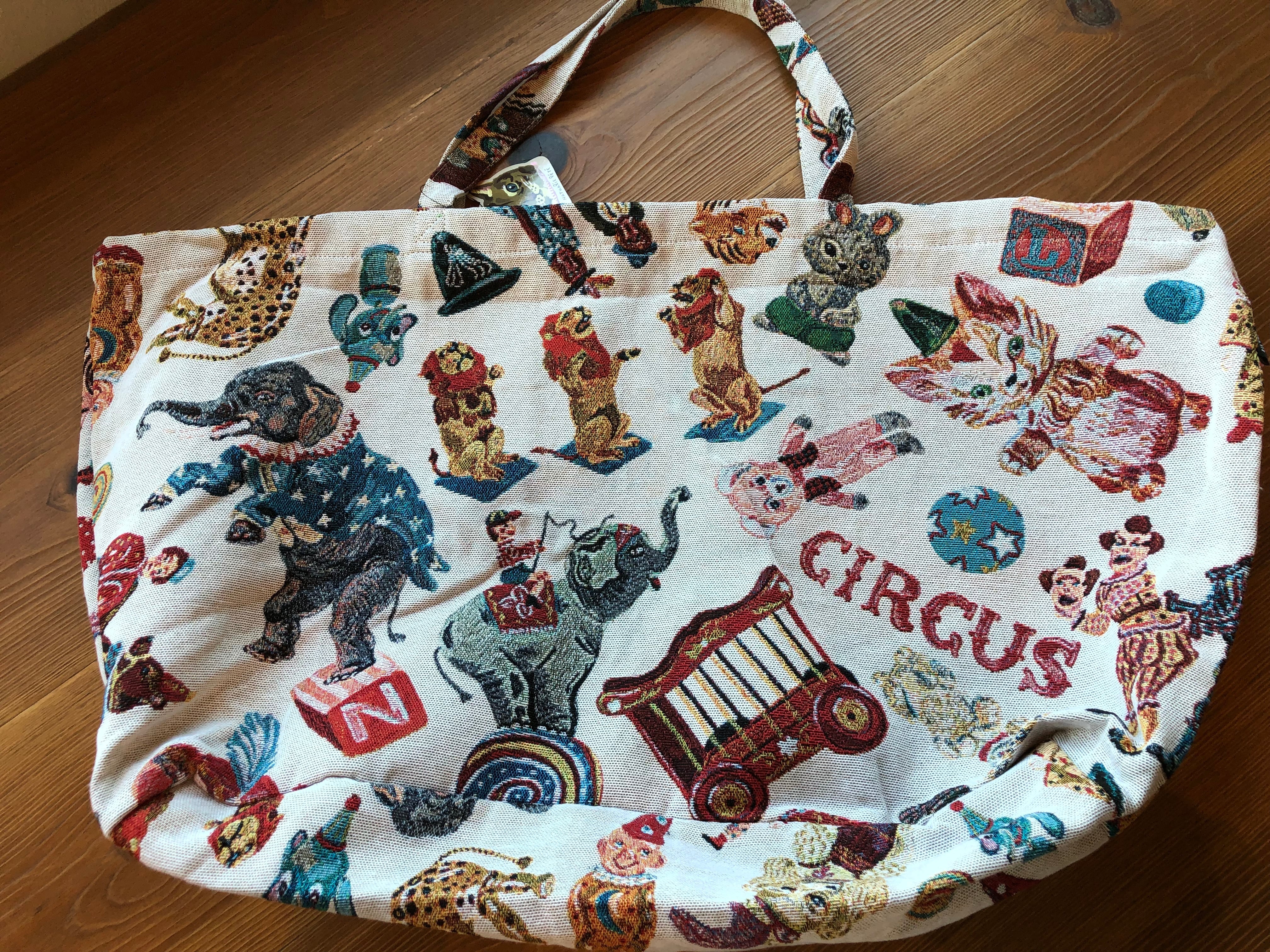 ホワイトベースに、サーカス柄の大振りバッグです。