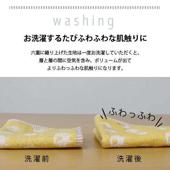 1枚1枚違う六枚のガーゼが折り重なって出来ていて、洗うたびにやわらかく肌になじむ究極の生地を使用。