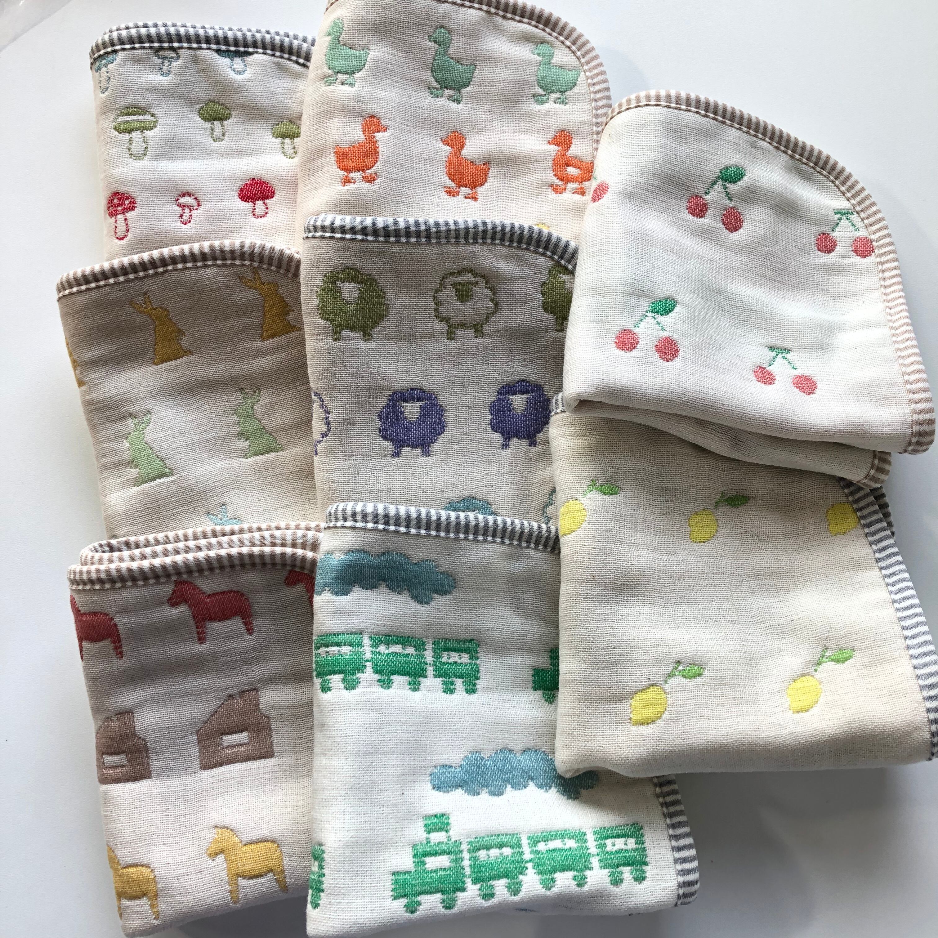 1枚1枚違う六枚のガーゼが折り重なって出来ていて、洗うたびにやわらかく肌になじむ究極の生地を使用。